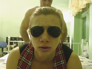 Тёлка в чёрных очках лицом на камеру практикует позу догги стай